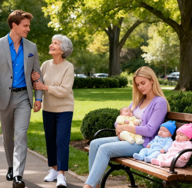 Była szczuplejsza, bledsza, wyraźnie wyniszczona. Jej dłonie obejmowały ochronnie troje niemowląt ułożonych obok niej jak kruche sekrety — maleńkie czapeczki, kocyki, butelka przy kolanie i torba z pieluchami, tak samo zużyta jak ona.