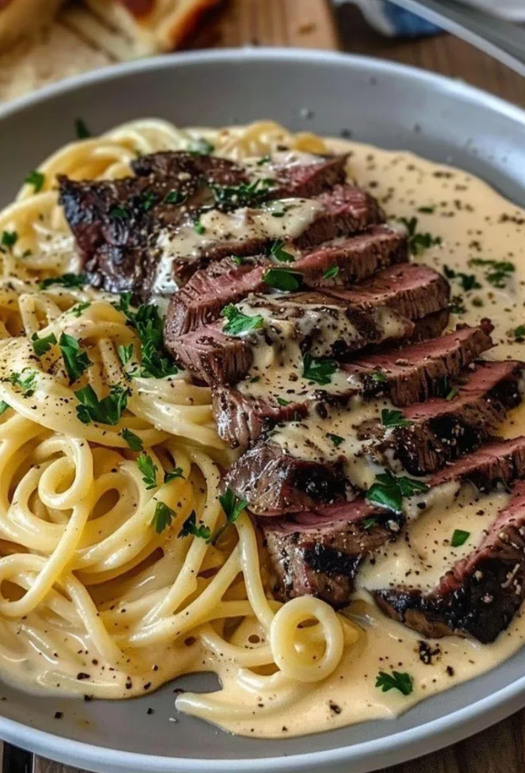 To także spotkanie różnych tekstur: chrupiącej skórki steku, miękkiego wnętrza mięsa, delikatnego makaronu i gładkiego sosu serowego. Całość tworzy danie pełne kontrastów, ale jednocześnie bardzo spójne.