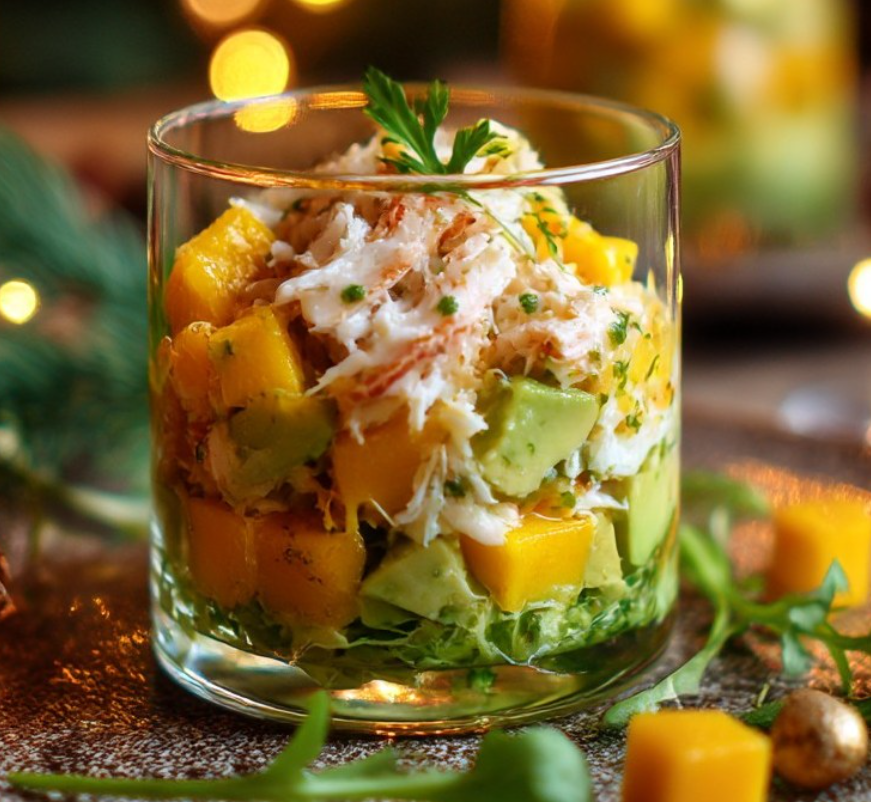 Świąteczne verrines z awokado, mango i mięsem kraba w stylu „egzotycznej sałatki bożonarodzeniowej” to przystawka, która łączy świeżość, lekkość i elegancję. Jest niezwykle prosta w przygotowaniu, a jednocześnie wygląda bardzo efektownie dzięki warstwowej formie i starannie dobranym detalom. To doskonały wybór na świąteczny stół, uroczystą kolację lub eleganckie przyjęcie, gdy chcesz zaskoczyć gości czymś lekkim, ale dopracowanym.