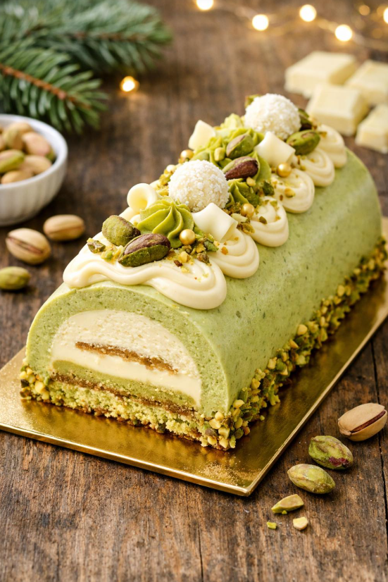 Świąteczny kloc z pistacjami i białą czekoladą to wyrafinowany deser, który łączy delikatność kremowego musu, intensywny smak pistacji oraz słodycz białej czekolady. To nowoczesna interpretacja klasycznego bożonarodzeniowego polana, idealna nie tylko na święta, ale również na eleganckie rodzinne spotkania czy uroczyste kolacje.