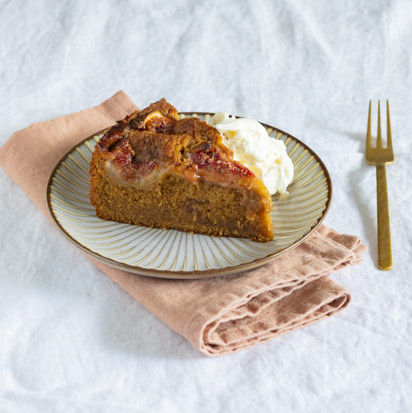 To niezwykle delikatne ciasto figowe zostało stworzone właśnie po to, by w pełni oddać charakter świeżych fig. Wilgotne, korzenne ciasto na bazie masła, ciemnobrązowego cukru i likieru Frangelico nadaje głębi, a figi podczas pieczenia miękną i zamieniają się w niemal dżemową warstwę, delikatnie bulgoczącą pod złocistą, chrupiącą skorupką z surowego cukru. Najlepiej smakuje lekko ciepłe, podane z aksamitnym kremem Frangelico, który dopełnia całość orzechowym aromatem.