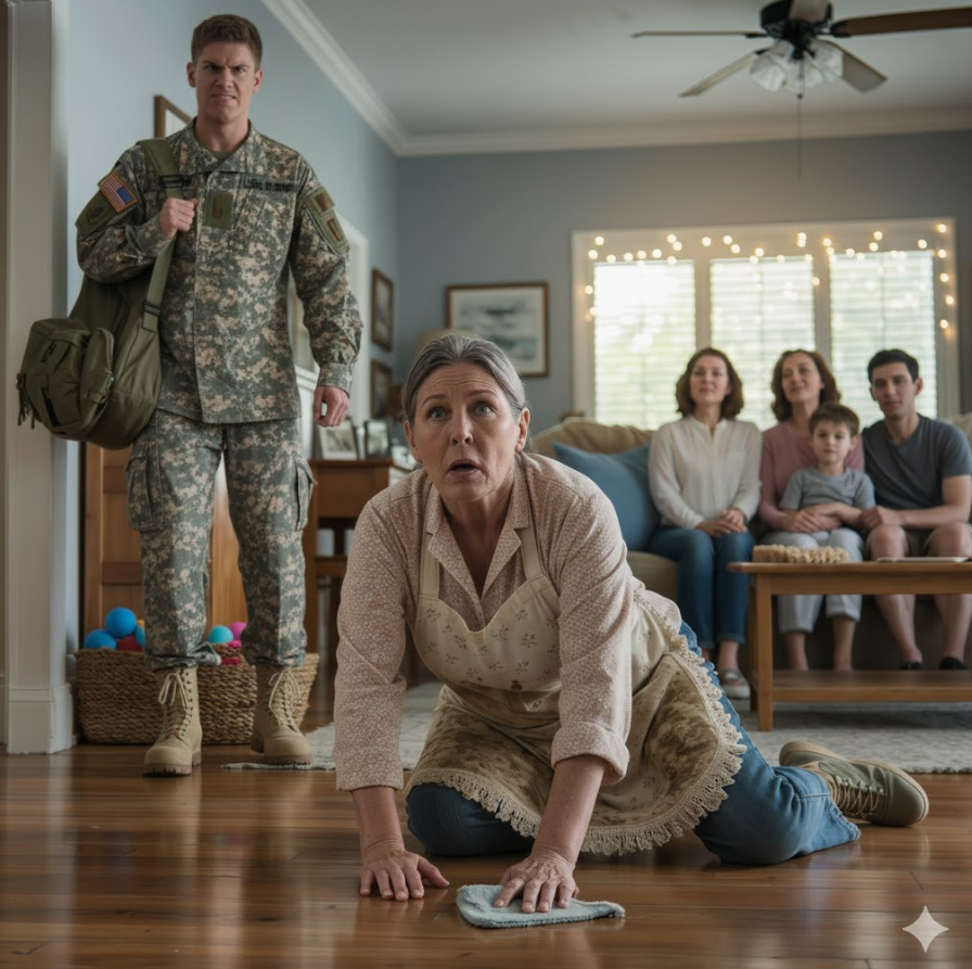 Po pięciu latach wojskowej misji mój syn wrócił do domu, chcąc zrobić mi niespodziankę. Nie zadzwonił wcześniej. Nie uprzedził nikogo. Po prostu otworzył drzwi. I zobaczył mnie klęczącą na podłodze, szorującą cudzą podłogę w domu, który mój mąż i ja kupiliśmy wspólnie, zanim zmarł. Spojrzał na mnie z niedowierzaniem i zapytał cicho: „Mamo… to ty?”. W tej jednej chwili pękło wszystko. Jego żona i jej rodzina zabrali mi wszystko, a on — widząc prawdę — wszedł do pokoju i powiedział tylko jedno: „To się kończy. Teraz”. Nikt nie spodziewał się tego, co stało się potem.