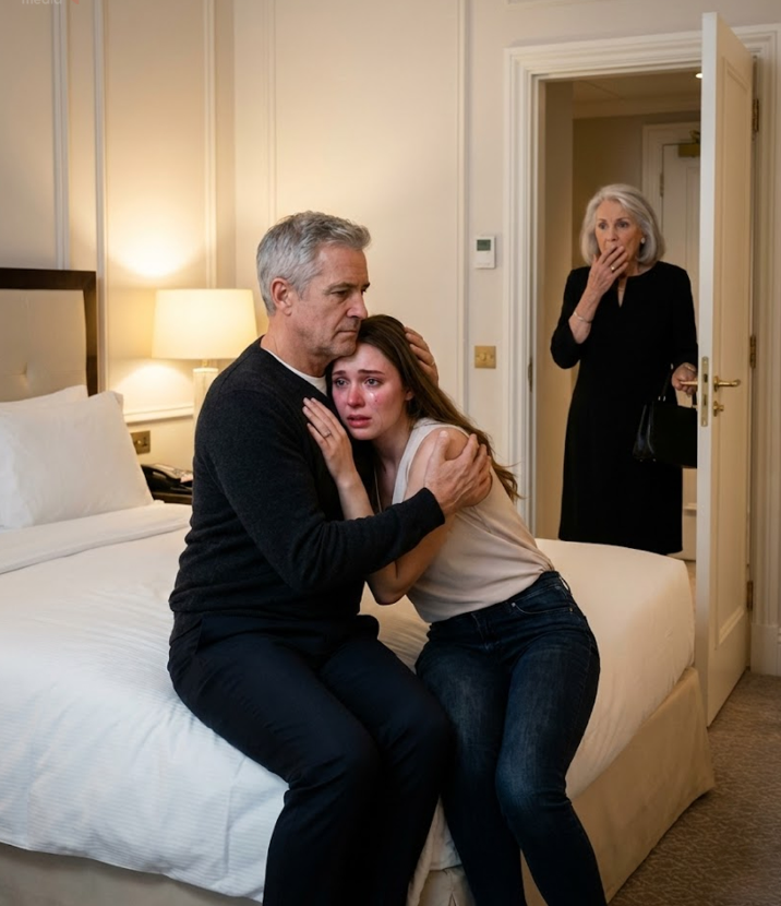 Caleb siedział na kanapie, pochylony w stronę Isabel. Ona siedziała obok, drżącymi ramionami wstrząsana szlochem, z łzami spływającymi po policzkach. Jego dłoń spoczywała delikatnie na jej ramieniu, jakby próbował ją uspokoić.