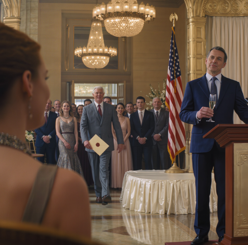 Mój ojciec miał na sobie granatowy smoking z przypinką w kształcie flagi na klapie — patriotyzm jako dodatek. Trzysta pięćdziesiąt osób pochylało się w jego stronę, jakby za chwilę miał ogłosić zwycięskie numery loterii.