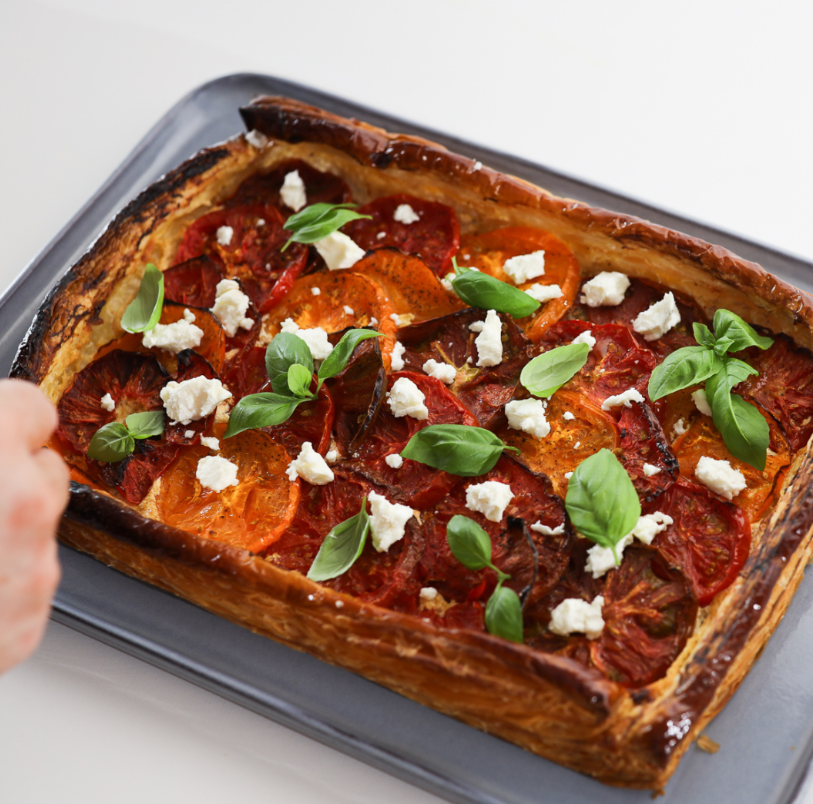Do przygotowania możesz użyć dobrej jakości gotowego ciasta francuskiego lub upiec je samodzielnie. Kształt tarty również pozostaje dowolny – może być okrągła, kwadratowa albo prostokątna, tak jak w tej wersji. Jeśli zdecydujesz się na własne ciasto francuskie i potrzebujesz wskazówek, warto sięgnąć po przepis prowadzony krok po kroku.