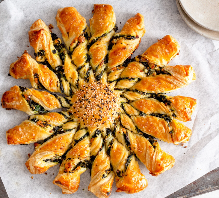 Połączenie delikatnego, listkującego się ciasta francuskiego z wytrawnym nadzieniem ze szpinaku i fety tworzy harmonijną całość. To idealna propozycja na rodzinny obiad, spotkanie z przyjaciółmi, świąteczny stół lub jako danie, które można postawić na środku stołu i wspólnie odrywać kolejne „promienie”.