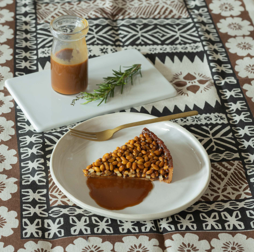 Tarta wnosi na stół nie tylko intensywny smak, lecz także bogactwo tekstur. Prażone orzeszki piniowe nadają złocistej chrupkości, karmel miodowy jest jedwabisty, lepki i głęboki, a świeży rozmaryn przełamuje słodycz wytrawną nutą. Całość zamknięta jest w cienkiej, kruchej i maślanej skorupce z delikatnego słodkiego ciasta. To wypiek, który wygląda elegancko, a jednocześnie zachowuje rustykalny urok.