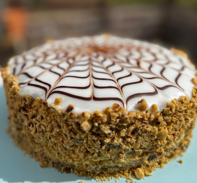 Tort Esterházy to klasyczny węgierski wypiek, znany z cienkich warstw bezy orzechowej typu dacquoise oraz aksamitnego kremu maślanego na bazie żółtek i orzechów laskowych. W tej wersji blaty mają zarówno charakter orzechowy, jak i delikatnie kakaowy, co nadaje im głębi smaku i subtelnego kontrastu.