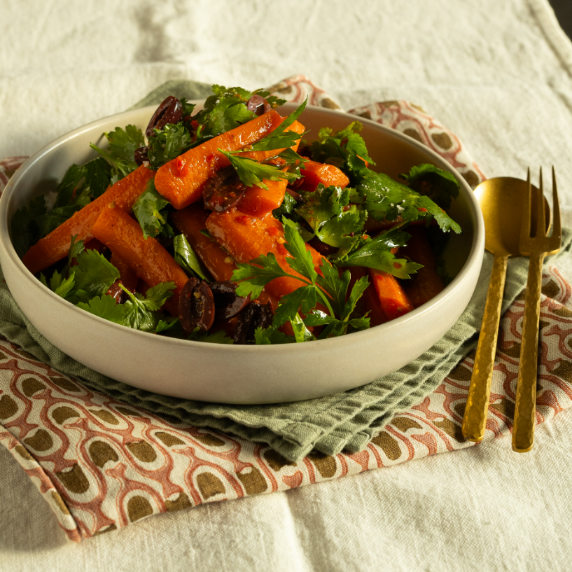 Ta tunezyjska sałatka z marchwi to danie, które od razu przyciąga uwagę intensywnym smakiem i charakterem. Inspirowana północnoafrykańskimi aromatami, łączy w sobie delikatność pieczonych marchewek z pikantną nutą pasty harissa oraz wyrazistością czarnych oliwek. Pieczenie wydobywa naturalną słodycz marchwi i nadaje jej miękką, niemal kremową strukturę, która doskonale kontrastuje z ostrym, kwaskowatym winegretem.