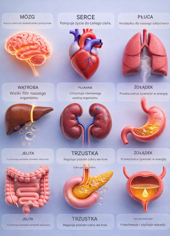 - ⚖️ Trzustka – reguluje poziom cukru we krwi, produkując insulinę, która umożliwia energii dotarcie do komórek.