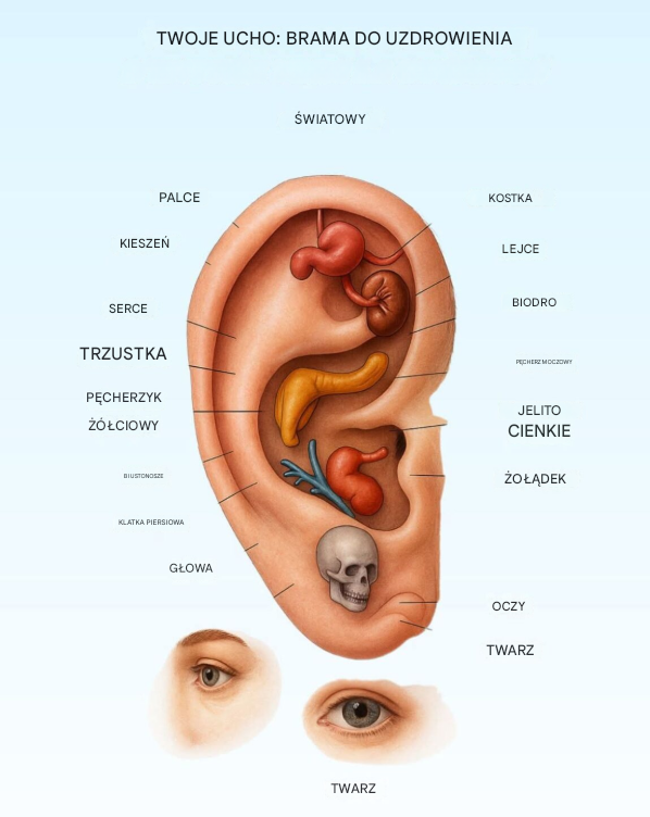 Ucho bywa czasami opisywane jako swoista mini mapa ludzkiego ciała. W tym ujęciu jego kształt i poszczególne strefy symbolicznie odpowiadają różnym częściom organizmu. Zgodnie z tą koncepcją każdy obszar ucha można powiązać z określoną funkcją ciała, narządem lub układem, a uważna obserwacja ucha – jego wrażliwości, napięcia czy reakcji na dotyk – bywa postrzegana jako sposób na lepsze zrozumienie sygnałów, jakie wysyła organizm.