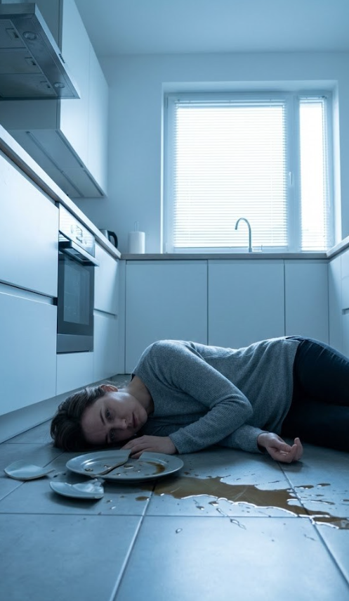 „Rachel?” — Ethan wbiegł do kuchni, panika w jego głosie była perfekcyjnie odegrana. Uklęknął obok mnie, sprawdził puls, szeptał moje imię z fałszywą czułością. Potem wstał i odszedł. Chwila ciszy. Dźwięk wybieranego numeru.