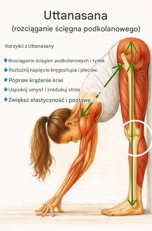 Uttanasana zapewnia intensywne, ale kontrolowane rozciąganie tylnej części ud oraz łydek. Mięśnie te są często skrócone na skutek długotrwałego siedzenia, braku ruchu lub jednostronnej aktywności fizycznej.