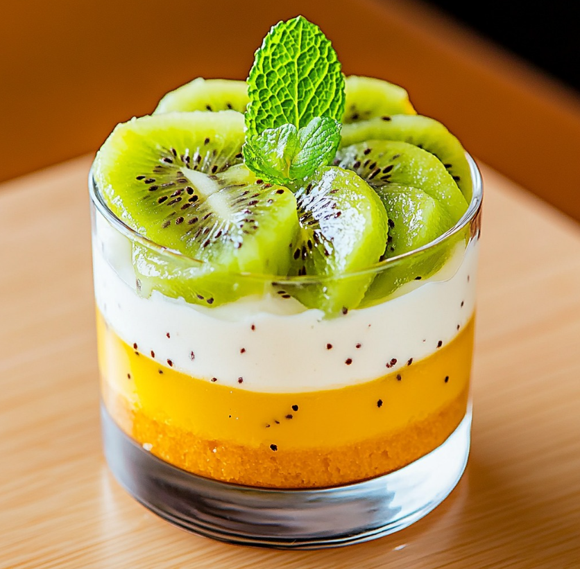 Verrines z kiwi, mango i waniliowym kremem z serka to lekki, efektowny deser podawany w szklankach, który zachwyca zarówno smakiem, jak i wyglądem. Połączenie kruchego spodu, intensywnie owocowego mango, delikatnej waniliowej masy oraz świeżego kiwi sprawia, że deser jest idealny na przyjęcia, święta, rodzinne spotkania lub jako wykwintna słodka przekąska po obiedzie.