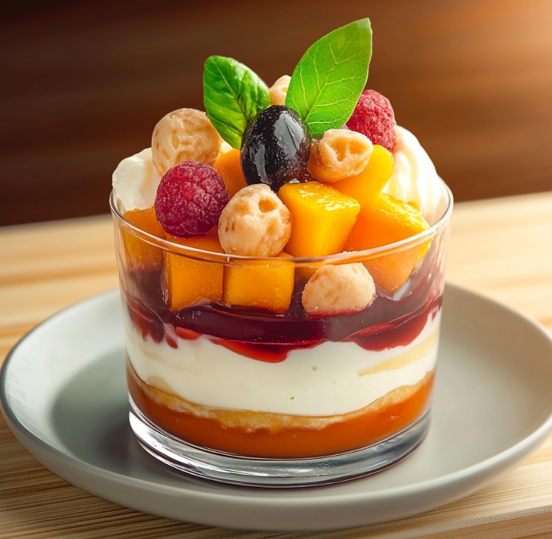 Verrines z owocami egzotycznymi, czerwonym coulis i kremem waniliowym to elegancki, warstwowy deser podawany w przezroczystych szklankach, który zachwyca zarówno smakiem, jak i wyglądem. Połączenie soczystych owoców, aksamitnego kremu na bazie mascarpone oraz intensywnego coulis z czerwonych owoców tworzy harmonijną kompozycję idealną na przyjęcia, uroczyste kolacje lub lekki deser po obiedzie.