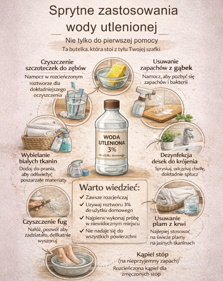 Woda utleniona to niepozorny klasyk, który większość z nas trzyma gdzieś z tyłu szafki łazienkowej lub w domowej apteczce. Często sięgamy po nią odruchowo przy drobnych skaleczeniach, ale jej możliwości są znacznie szersze. Przy odpowiednim rozcieńczeniu i rozsądnym stosowaniu potrafi naprawdę uratować sytuację w domu.