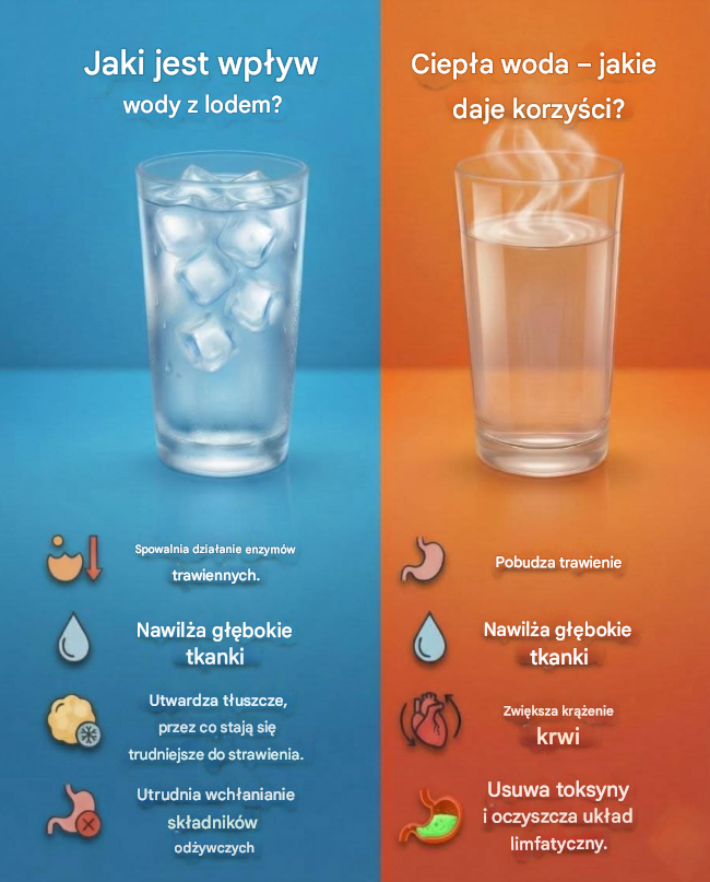 Zimna woda może skutecznie pomóc w obniżeniu temperatury ciała oraz przynieść krótkotrwałe pobudzenie. Jednak warto pamiętać, że bardzo niska temperatura napoju może wpływać na proces trawienia. Skrajny chłód bywa przyczyną czasowego spowolnienia pracy enzymów trawiennych oraz może utrudniać rozkład tłuszczów, co sprawia, że przyswajanie składników odżywczych po posiłku staje się mniej efektywne.