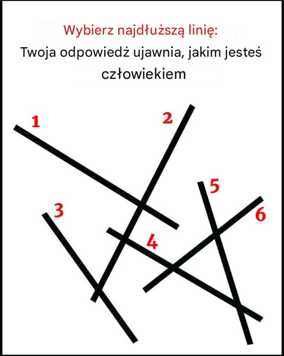 Na pierwszy rzut oka ten test może wydawać się banalnie prosty. Widzisz sześć czarnych linii o różnej długości, każda oznaczona czerwoną liczbą od 1 do 6. Twoim jedynym zadaniem jest wskazanie tej, która wydaje Ci się najdłuższa. Bez mierzenia, bez porównywania – po prostu wybierz tę, która intuicyjnie przyciąga Twój wzrok.