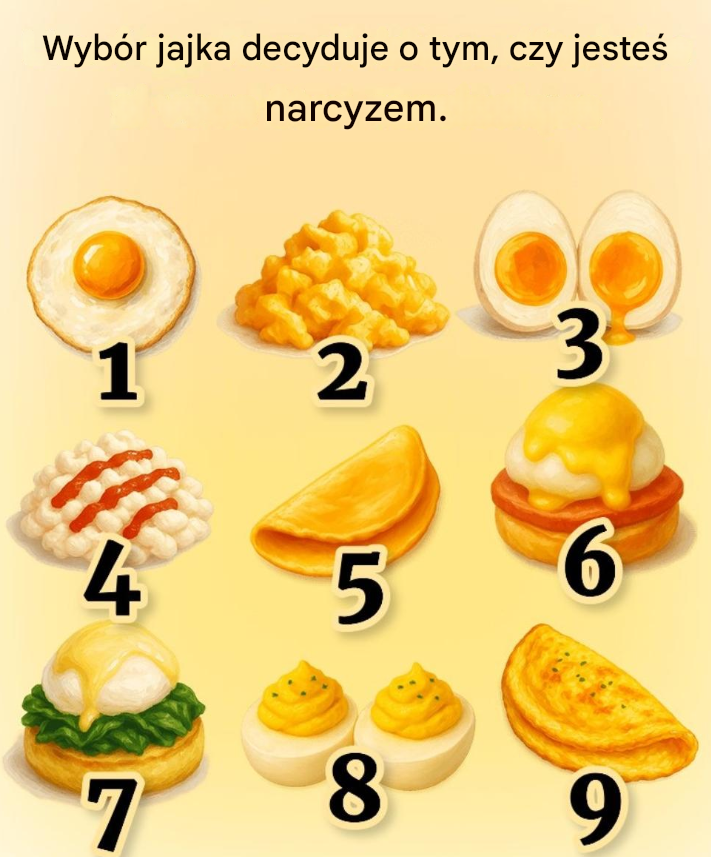 Jajka są jednym z najbardziej uniwersalnych produktów śniadaniowych. Można je przygotować na dziesiątki sposobów, a każdy z nich wywołuje inne skojarzenia. Przyjrzyj się dziewięciu formom przygotowania jajek. Wybierz tę, która instynktownie najbardziej Ci się podoba – nie tę, która „wypada najlepiej”, lecz tę, która naprawdę do Ciebie przemawia. Następnie sprawdź, co ten wybór może mówić o Twojej osobowości i czy kryje się w nim choć cień narcyzmu.