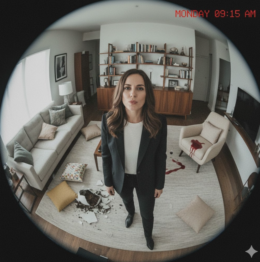 Nagrania z salonu przyprawiły mnie o zawrót głowy. Czwartek: Melissa i Derek z torbami, wymieniają spojrzenie, które widuję tylko tuż przed kłopotami. Potem obcy ludzie — ośmioro — piją z moich szklanek, krzyczą, czyjaś ręka strąca wazon po babci, a stopa wsuwa odłamki pod kanapę. Piątek: powiększenie sypialni. Kobieta w mojej ulubionej sukience. Mężczyzna otwiera szkatułkę, palce wsuwają łańcuszek do kieszeni, ona śmieje się i pozuje w moim lustrze. Sobota: Melissa i Derek rozwaleni w moim łóżku, gdy impreza oddycha obok. Niedziela: graffiti markerem na ścianie, papieros wypalający dziurę w sofie. Poniedziałek: pantomima sprzątania, przelana fiołkowa afrykańska brązowieje, a Melissa zatrzymuje się, patrzy prosto w obiektyw i formuje słowa: „Dzięki, siostrzyczko”.