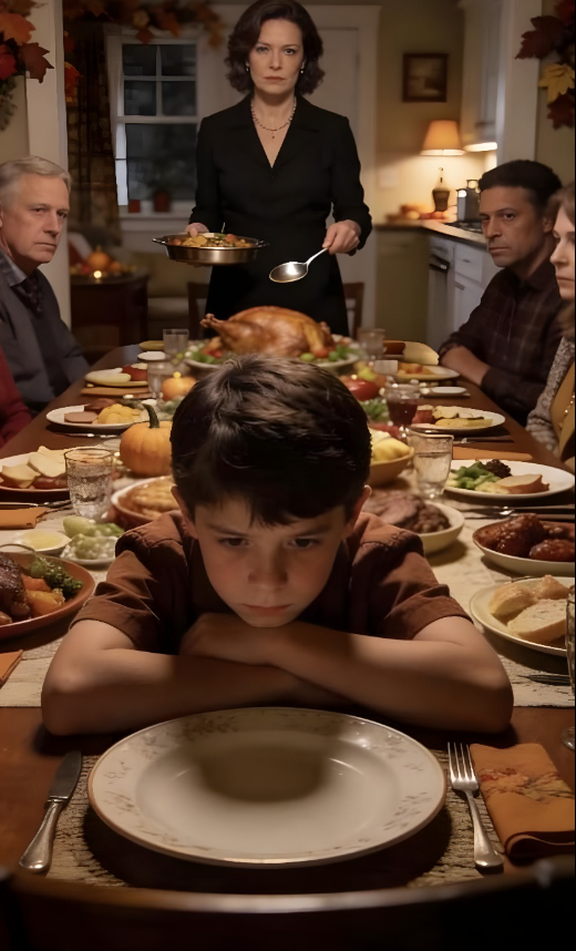 Stół wyglądał idealnie: białe talerze, starannie złożone lniane serwetki, świece ustawione z aptekarską precyzją. Margaret poruszała się wokół jak generał dokonujący inspekcji. Gdy wszyscy usiedli, wzięła chochlę i zaczęła nakładać dania — indyka, puree ziemniaczane, farsz — z tym samym wyćwiczonym uśmiechem.