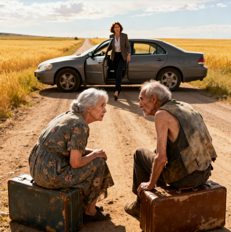 Na początku były to tylko kształty. Dwie sterty ubrań? Porzucone worki? Lecz im bardziej się zbliżała, tym wyraźniej widziała, że to ludzie. Starszy mężczyzna i kobieta siedzieli obok siebie na dwóch dużych, staromodnych walizkach, tuż przy żwirowym poboczu. Nie machali. Nawet nie patrzyli na drogę. Po prostu… byli. Zgarbieni w postawie tak głębokiego zmęczenia, że zdawało się ono falować wokół nich jak drgające powietrze nad rozgrzanym asfaltem.