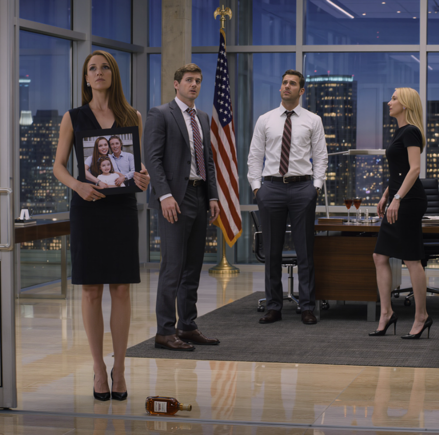 Adrien siedział odchylony w skórzanym fotelu, z poluzowanym krawatem i głupkowatym uśmiechem na twarzy. Na jego biurku siedziała Melissa, jego asystentka, w krótkiej, jedwabnej sukience, która podsuwała się wyżej, gdy pochylała się ku niemu. Jedną dłonią sunęła po jego klatce piersiowej, jakby należał do niej. Jego ręka spoczywała na jej udzie.