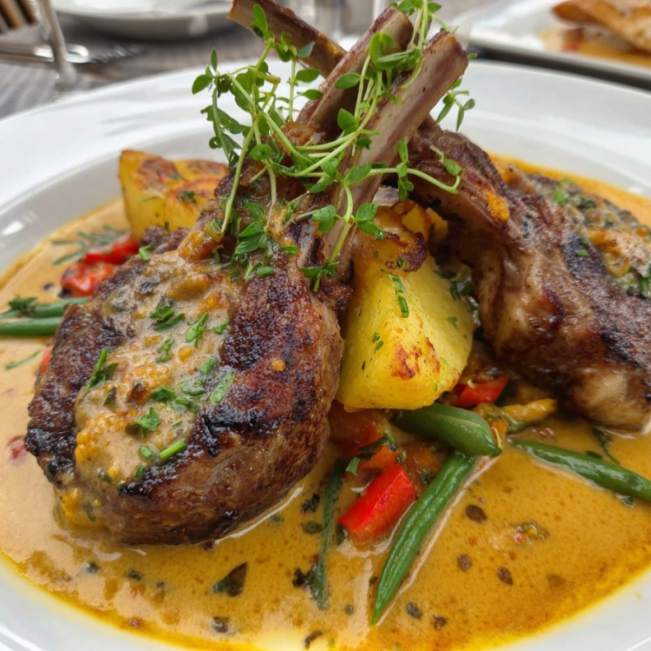 Żeberka jagnięce w kremowym sosie musztardowym z podsmażanymi warzywami to propozycja wyrafinowanego, a jednocześnie sycącego dania, idealnego na elegancki obiad lub kolację dla dwojga. Delikatna, lekko różowa jagnięcina doskonale komponuje się z aksamitnym sosem na bazie śmietanki i musztardy, który łączy w sobie łagodność oraz subtelną, pikantną nutę. Całość uzupełniają chrupiące warzywa smażone na patelni, dodające potrawie koloru, tekstury i świeżości.