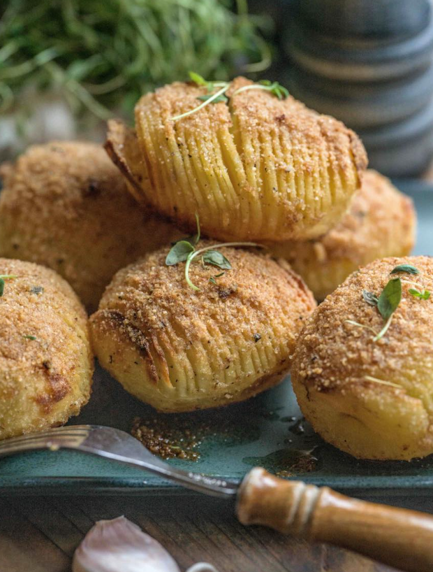 Ziemniaki Hasselback to prawdziwa klasyka wśród dań ziemniaczanych – efektowne, chrupiące na zewnątrz, miękkie i maślane w środku. Dzięki charakterystycznemu nacinaniu przypominają harmonijkę, co sprawia, że masło i przyprawy wnikają głęboko pomiędzy plasterki, nadając im wyjątkowy smak i aromat. W tej wersji ziemniaki zostały wzbogacone czosnkiem i tymiankiem, które idealnie podkreślają ich naturalną słodycz i ziemisty charakter.