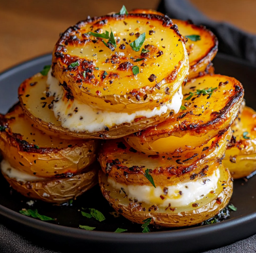 - Składanie „piramidek”: wyjmij ziemniaki z piekarnika. Na jednej plaster ziemniaka połóż plaster sera, a następnie przykryj go drugim plastrem ziemniaka, tworząc niewielkie stosiki.