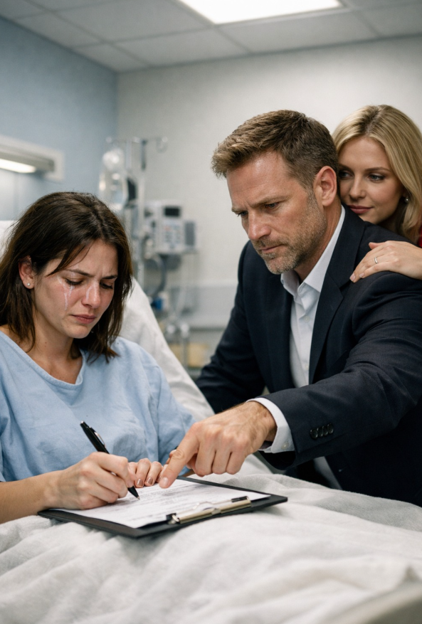 Przy jej łóżku stał Daniel — jej mąż. Nienaganny garnitur, idealnie ułożone włosy, chłodny spokój człowieka, który nie zamierzał okazywać współczucia. W jednej dłoni trzymał długopis, w drugiej plik dokumentów.