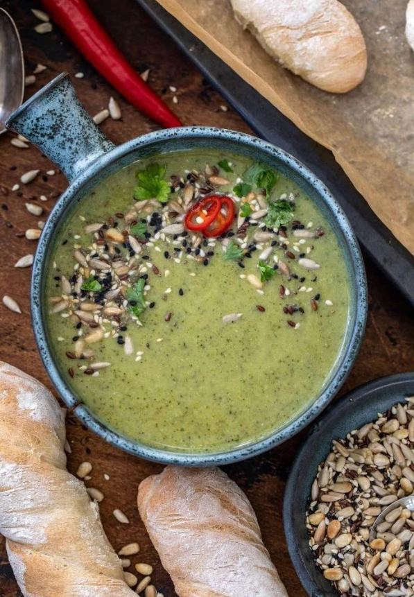 Jeśli jest coś, co uwielbiamy jeść na co dzień, to zupa z dobrym chlebem! Zupa brokułowa jest bardzo łatwa i szybka w przygotowaniu, a ja dodaję do niej trochę chili, które naprawdę podbija smaki i dodaje tej odrobiny ostrości 🙂 Robię tę zupę ze świeżych brokułów, ponieważ uważam, że smakuje o wiele lepiej niż ta z mrożonych. Do zupy dodałam także kilka różnych nasion, które uprażyłam na patelni. Możesz użyć dowolnych, które masz w domu, na przykład sezamu, pestek dyni, siemienia lnianego lub słonecznika.