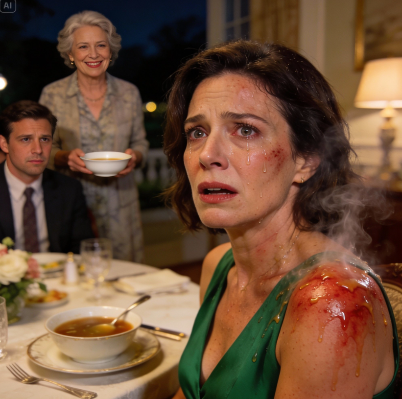 Uśmiech Isabelli stężał. Wstała, podniosła miskę i zanim zdążyłam zrozumieć, co się dzieje, wylała gorącą zupę prosto na moją twarz. Spłynęła po policzku, szyi, sukience — parząca, lepka i upokarzająca. Isabella pochyliła się z tym samym uprzejmym uśmiechem i powiedziała: „Na to zasłużyłaś”.