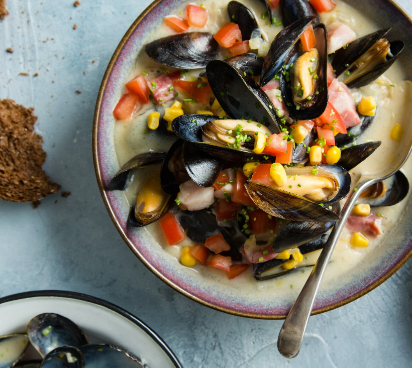 Połączenie rybnego bulionu, mleka, białego wina i świeżych małży tworzy zupę pełną charakteru, w której każdy składnik ma swoje wyraźne miejsce. Całość doskonale komponuje się z chrupiącym, wiejskim chlebem, który pozwala wydobyć z talerza każdy aromatyczny łyk.