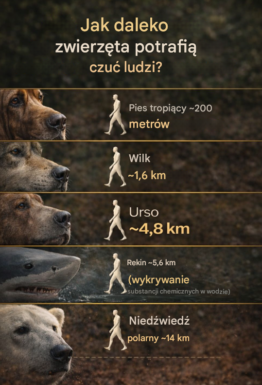 📍 W zależności od warunków atmosferycznych potrafi wyczuć zapach człowieka lub jedzenia z odległości 3–5 kilometrów.